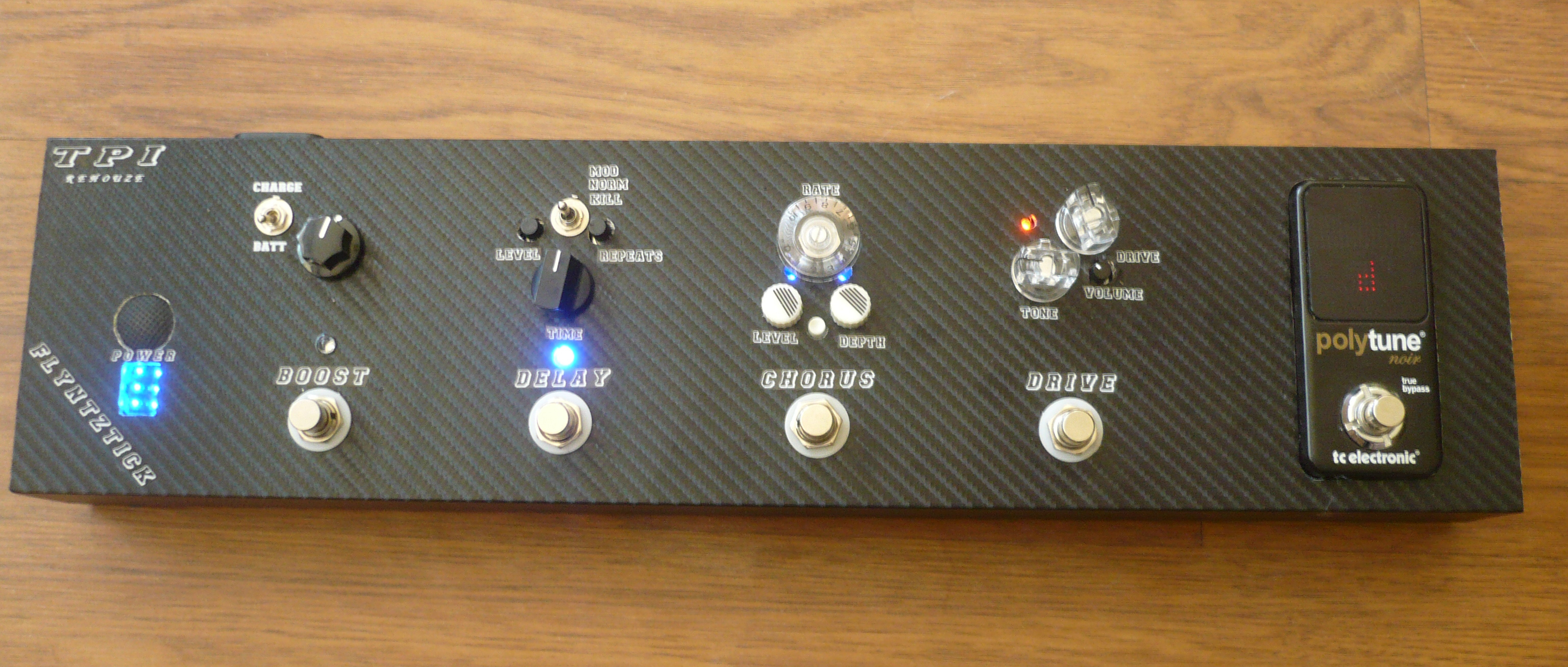Your favorite pedals or our overdrive, chorus, delay, boost built into this handsome carbon fiber wrapped super strong aluminum enclosure. Powered by a Pedal train Volto rechargeable battery 9vdc power supply. Plenty of power to last all night long or plug it in and use standard wall power to power the power supply. Call for pricing