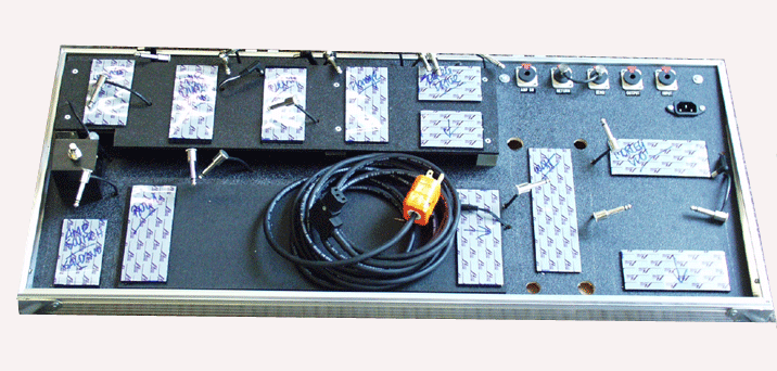 When you receive your pre-wired pedalboard, it will be set up so all you have to do is, peel the velcro, stick the pedal in place, and plug it in for the last time. The pre-wired pedalboard looks something like this.